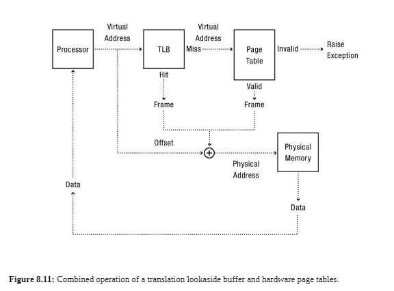 }- On a lookup, the TLB hardware checks all of the entries against the virtual page. If there is a match, the TLB returns the physical address. (TLB hit) If none of the entries match, the hardware does the full address translation and is added to the TLB, usually replacing the least recently used entry.