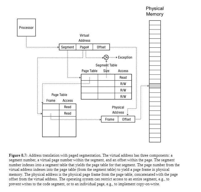 - Page Table: Similar to segment table,its entries contain pointers to page frames. No need for a bound since all page sizes are the same.